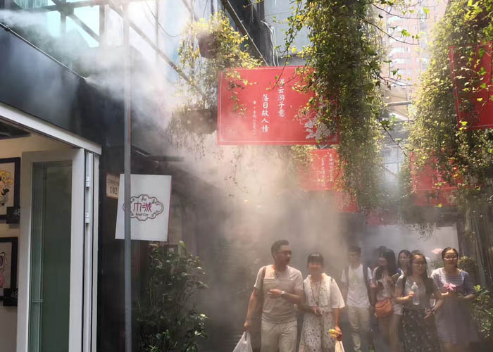作為上海的3A景區(qū)之一,田子坊每天都人頭攢動,連日高溫讓許多游客不能細細品味老上海的弄堂風情。為此,管委會采用了綠友集團自行研發(fā)制造的GREENMAN造霧系統(tǒng),200多個噴頭每小時噴霧三次,每次噴霧2分鐘,配合弄堂兩邊墻壁種植的綠化,不僅美化了街景,更對降低整個田子坊的溫度起到了有效的作用。現(xiàn)場溫度計顯示,不進行噴霧的弄堂溫度是36 攝氏度,噴霧后,弄堂溫度顯示33攝氏度,最低的地方溫度甚至降到28攝氏度,降溫明顯。