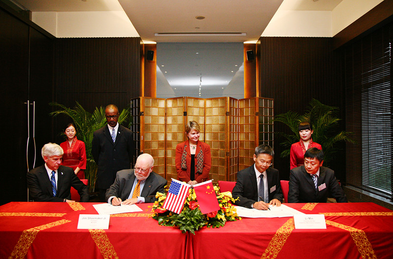 現場氣氛熱情友好,三位睿智而又幽默的發言贏得了現場觀眾的不斷笑聲與熱烈掌聲。簽約儀式尾聲,州長先生特意將兩支簽字筆,分別贈送給木霸克公司總裁詹姆斯·舒馬克先生和綠友集團總裁李敏先生,并合影留念。