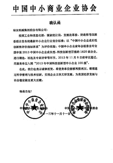 綠友榮獲“2013年中國(guó)科技創(chuàng)新型中小企業(yè)100強(qiáng)” 確認(rèn)函: