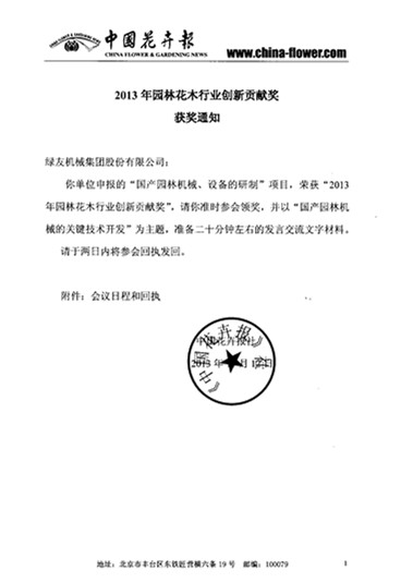 綠友榮獲“2013年園林花木行業(yè)創(chuàng)新貢獻(xiàn)獎(jiǎng)”獲獎(jiǎng)通知: