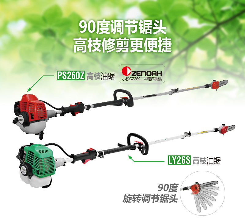 美神高枝油鋸,90度可旋轉(zhuǎn)刀頭,奧里根導(dǎo)板和鏈條;整機長度3米,適用于高空樹枝的修伐。