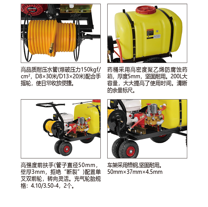 高密度聚乙烯防腐蝕藥箱,藥箱上配有刻度藥量顯示,及時(shí)掌握藥液噴灑情況;靈活可轉(zhuǎn)動(dòng)的前扶手設(shè)計(jì),轉(zhuǎn)向靈活;單叉雙前輪設(shè)計(jì),前輪直徑255mm;雙管雙槍?zhuān)焊邏簶專(zhuān)F化槍各1套, 高壓水管:D8×30m ,D13×20m