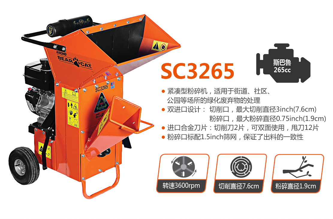 老熊(BEARCAT)品牌小型粉碎機,配置斯巴魯265cc發(fā)動機,擁有切削、粉碎兩個進(jìn)料口,以及可更換出料篩網(wǎng),最大可以切削3英寸(7.5cm)枝椏。體積小,操作靈活,適用公園、廣場、物業(yè)等多種區(qū)域。