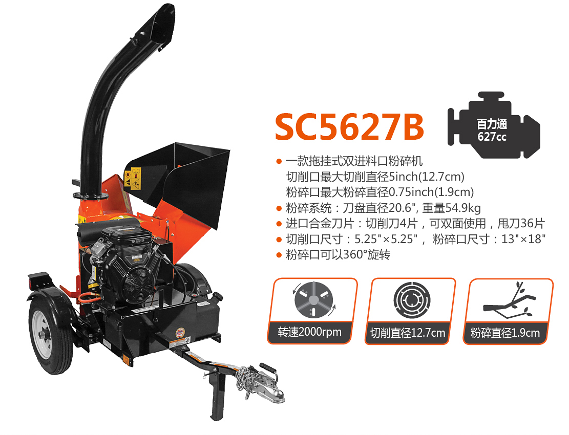 老熊(BEARCAT)品牌樹枝粉碎機,配置斯巴魯720cc發動機。擁有切削、粉碎兩個功能,最大可切削5英寸(12.7cm)枝椏,粉碎3/4英寸(2cm)枝椏。4片切削刀和36片粉碎刀保證了高效的處理效率。