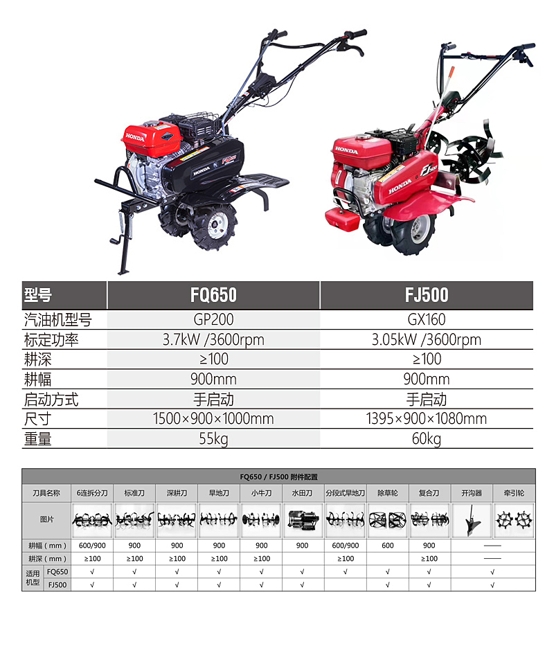 根據(jù)土壤硬度和耕作需要可選擇標(biāo)準(zhǔn)刀、深耕刀、除草輪、復(fù)合刀、開(kāi)溝器、旱地刀等不同刀具。